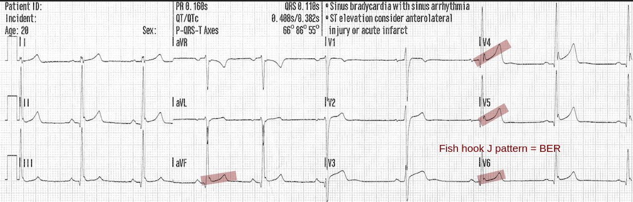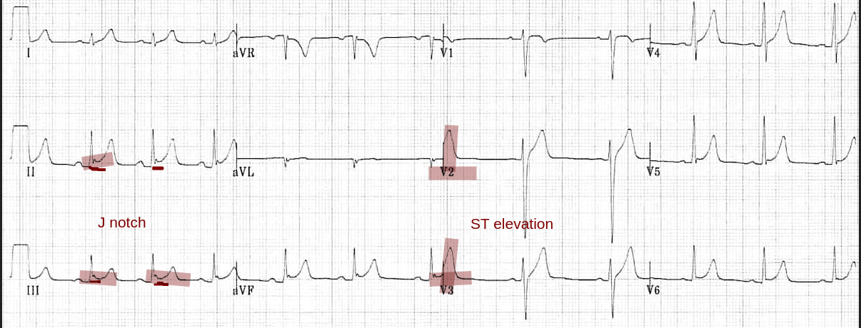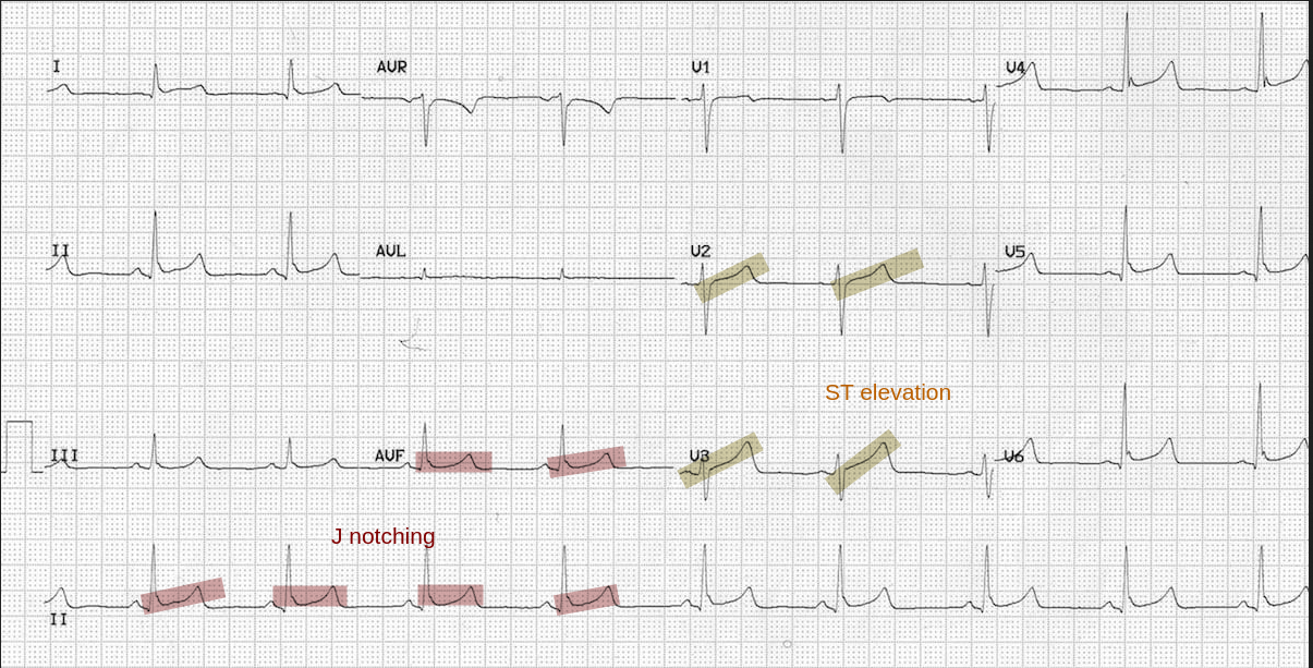 - Widespread concave ST elevation, most prominent in the mid-to-left precordial leads (V2-5)