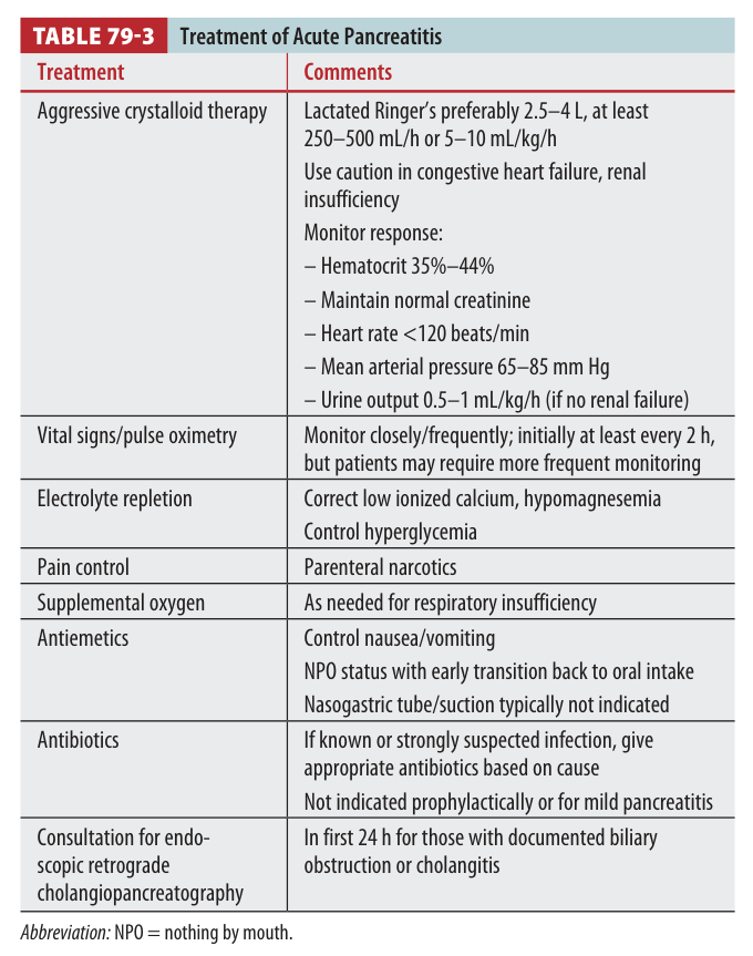 Crystalloids are the resuscitation fluids of choice. NS in large volumes may cause a nongap hyperchloremic acidosis and can worsen pancreatitis, possibly by activating trypsinogen and making acinar cells more susceptible to injury.