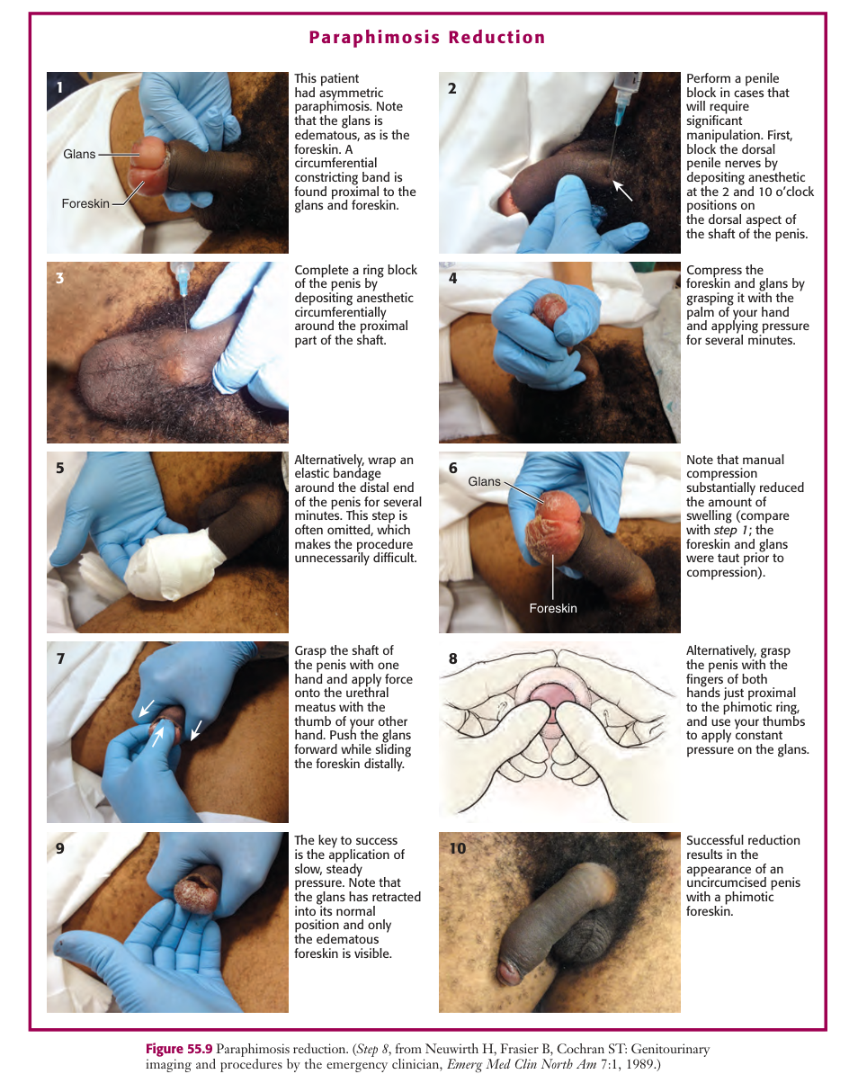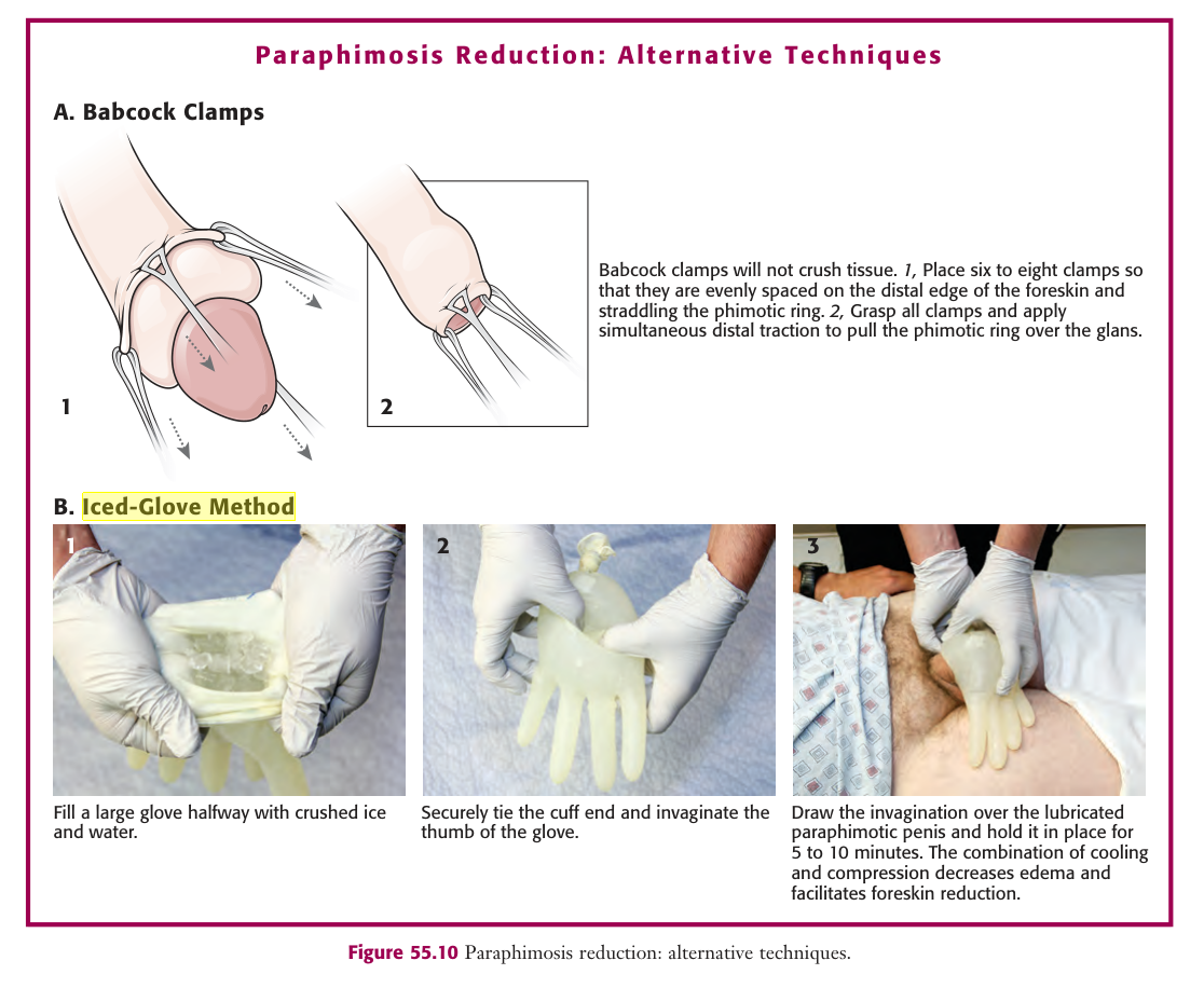 Paraphimosis is the inability to completely reduce the penile foreskin distally, back to its natural position overlying the glans penis. This condition occurs exclusively in uncircumcised males and is a urologic emergency.