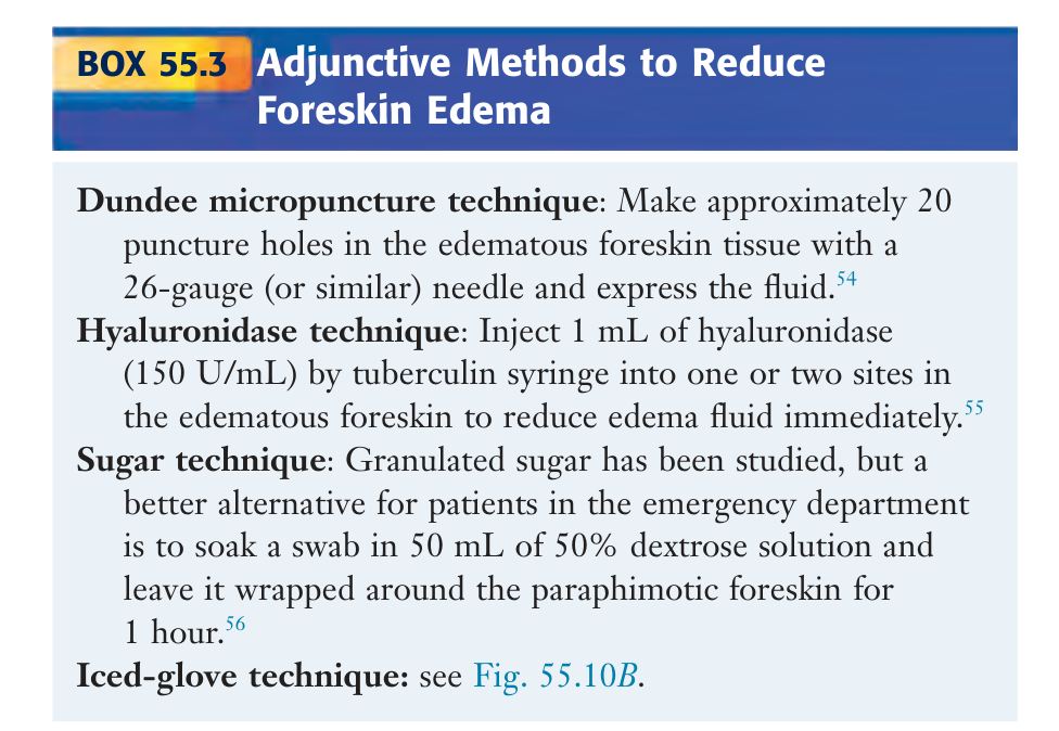 If unsuccessful, reduce the paraphimosis surgically by dorsal slit or definitive circumcision.