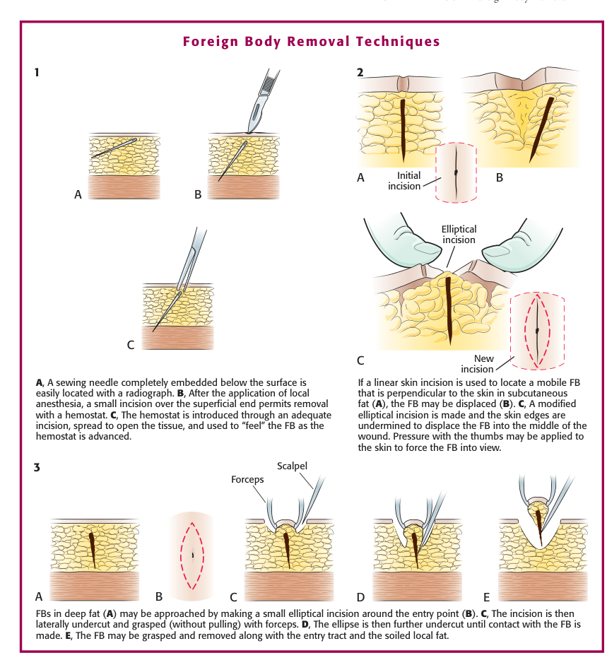 Foreign body in wound Foreign Body & Imaging to diagnosis¶ Foreign Body Removal¶ Sweing Needle Removal¶ Puncture Wound Removal¶ FB under Nail¶ Ring Removal using String Method¶ Zipper SkinRemoval¶