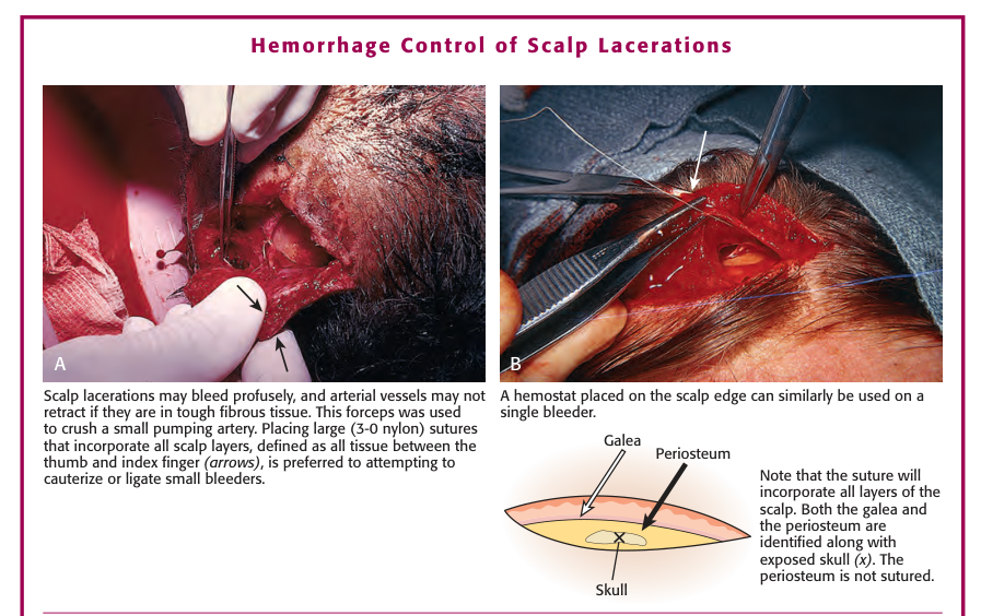 - bleeding profusly and cannot irrigate , clamping and everting galea /dermis with round edge hemostats