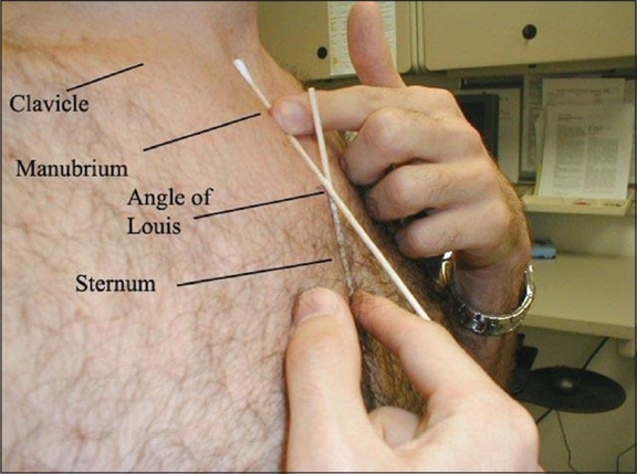 2. Extend card or ruler horizontally from highest pulsation point , cross with ruler placed on the sternal angle (Angle of Louis), (let's say it was 8cm).
