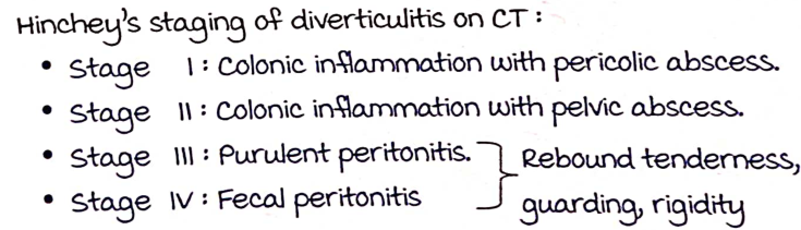bowel tumors and Lesions¶ Fecal fistula natural closure¶ mortality risk in Fecal fistula¶ Diverticulosis¶ hincheys CECT classiifcation of diverticulitis¶