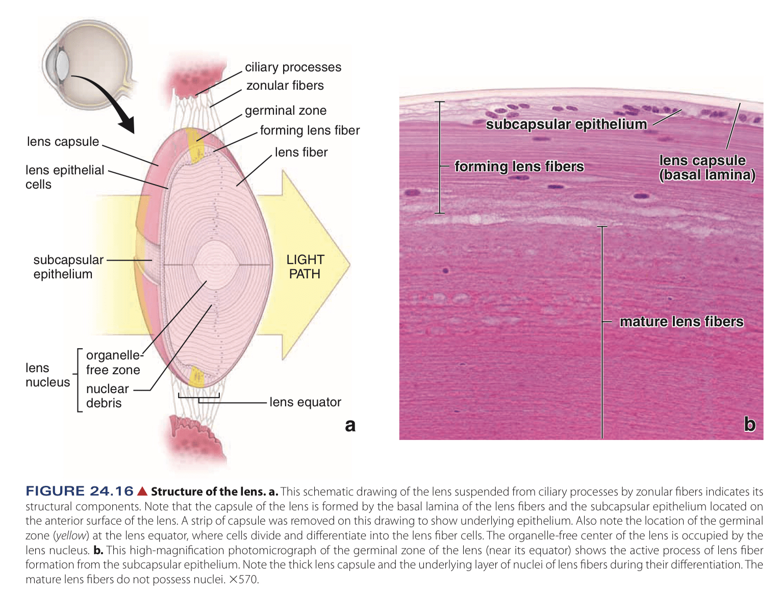 - Elongated Epithelium lacks Nucleus,Oragnales filled with crystalins