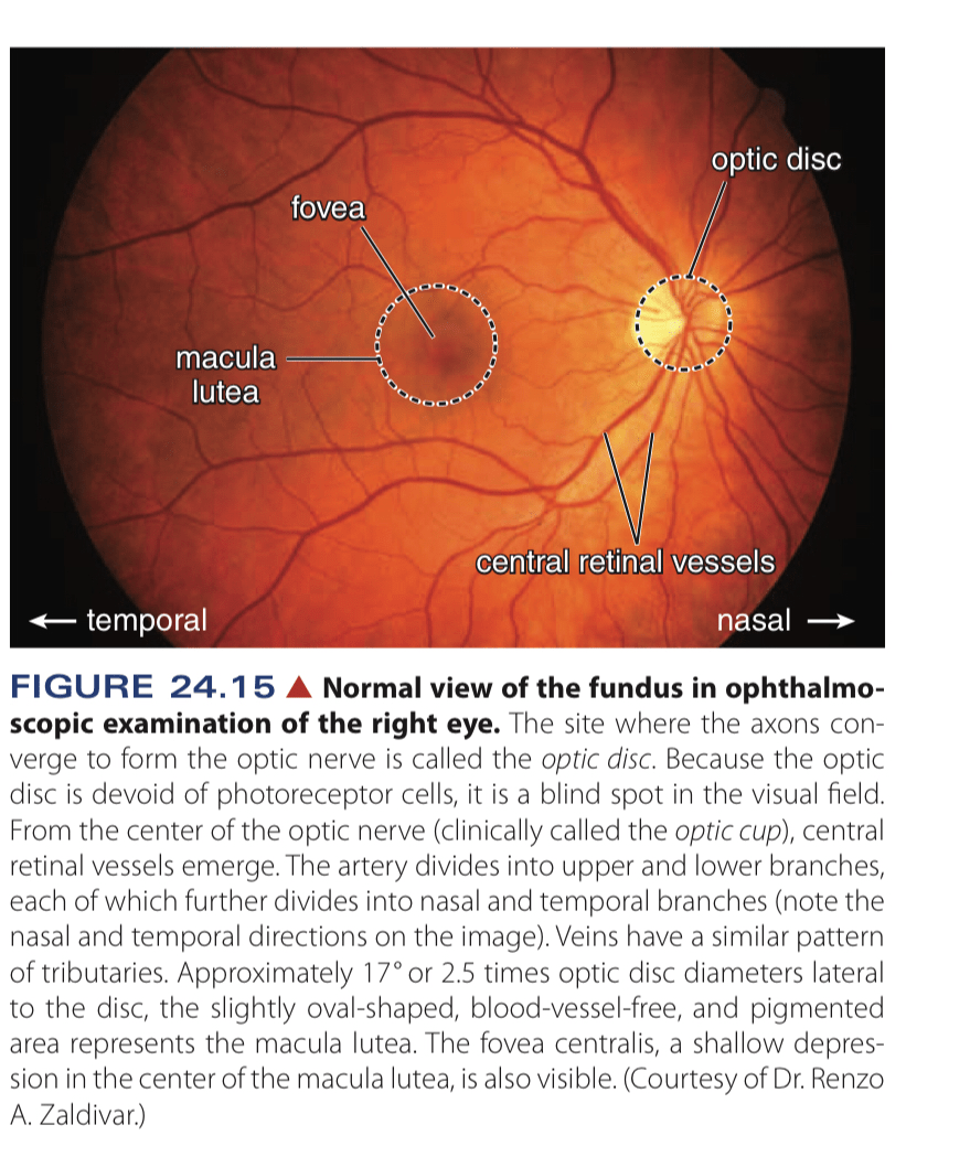 - Optic nerve fibres all the Retina leaves the eye into brain , no hole into brain Blind Spot…..