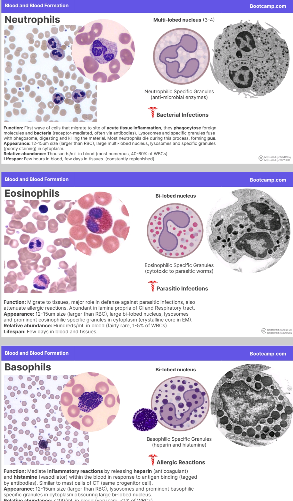 Basophils¶ Size¶ - 2-3 times RBC Nucleus¶ - two lobes Cytoplasm¶ - red granules special to them Function¶ Located at lamina properia of GI,LUNGS ..... Parasite elimination by dumping granules specific to them calm down Basophils reaction