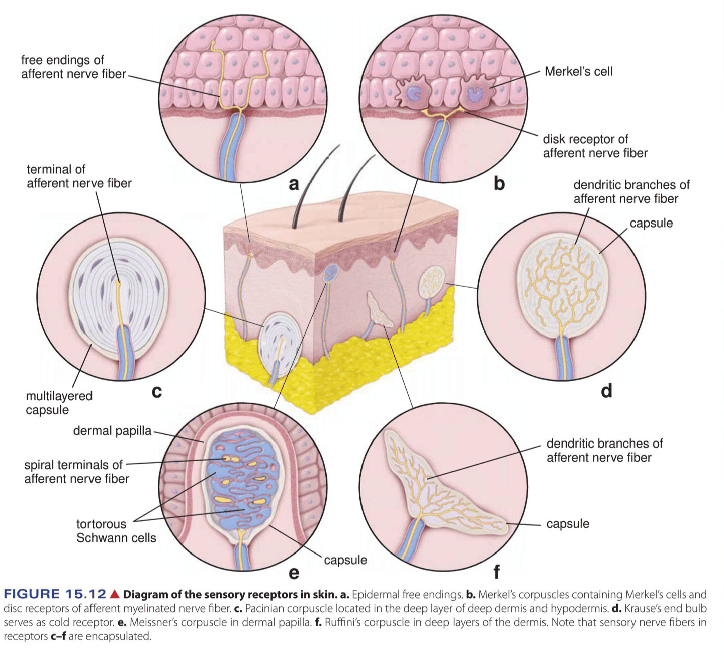 | Free Nerve Endings | Pacinian Corpuscle | Meissner's Corpuscle | Ruffini Corpuscle | |