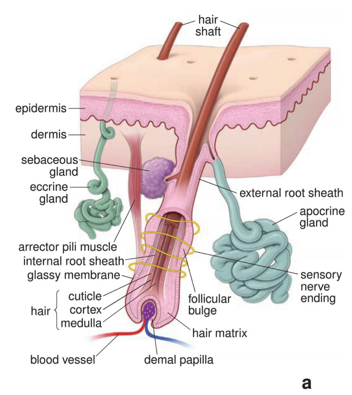 - Hair follicular > epidermis invaginate into dermis like gland formation then the stems cells form hair bulb and produces keratin and bundles them hair.